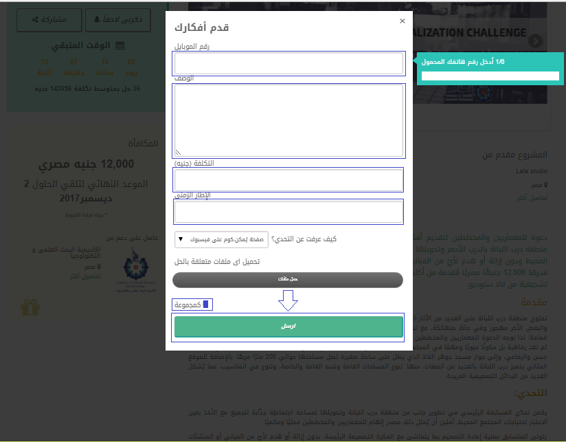 5- نقوم باستكمال بيانات التقديم ، بإدخال بيانات باقي الفريق ، وإذا كانت الملفات المطلوبة جاهزة بمقدورك رفعها أو رفعها لاحقًا ثم الضغط على "أرسل":