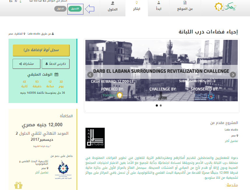 1- الدخول على صفحة التحدي من وتسجيل حساب جديد عبر الضغط على تبويب "التسجيل" أعلى الصفحة: